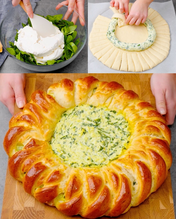 Oblikovanje pogace: Nakon što je tijesto naraslo, razvaljajte ga na pobrašnjenoj površini u veliki krug. Upotrijebite okrugli poklopac ili tanjur da označite sredinu, ali nemojte rezati kroz tijesto. Oko označenog kruga, ravnomjerno rasporedite nadjev od sira i špinata.