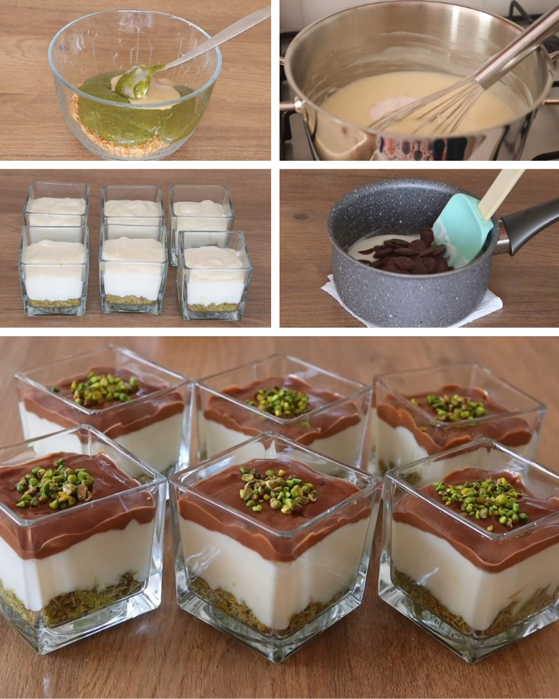 U desertne čaše ili posudice rasporedite **sloj kadayıfa s pistacijama**.