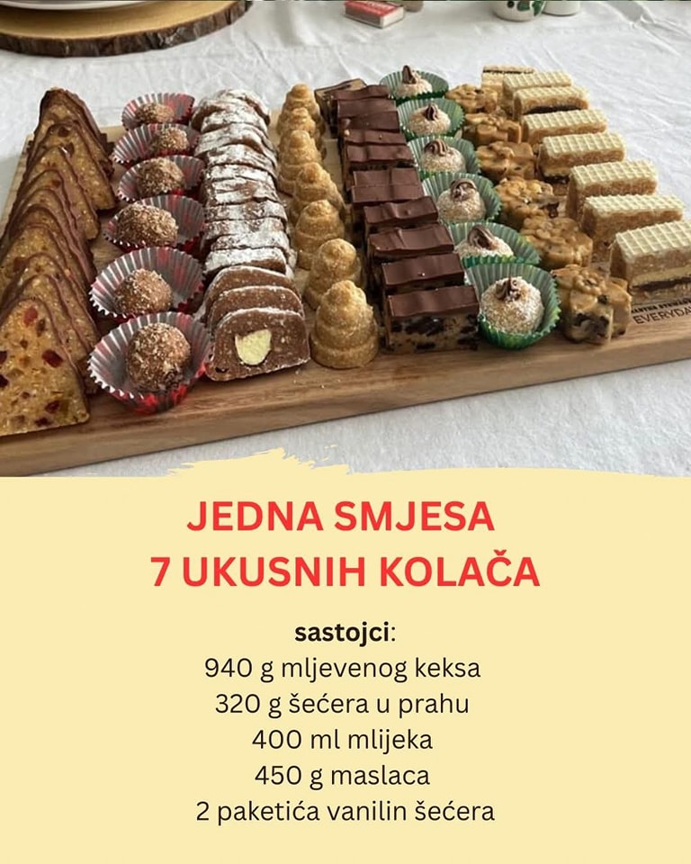 Osnovna smjesa se sastoji od 940 grama mljevenog keksa, 320 grama šećera u prahu, 400 mililitara mlijeka, 450 grama maslaca i 2 paketića vanilin šećera.