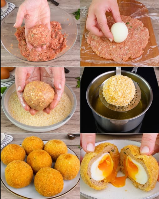 Podijelite mesnu smjesu na 8 dijelova. Svaki dio spljoštite u dlanovima i obložite jedno kuhano jaje, tako da ga potpuno prekrije meso.