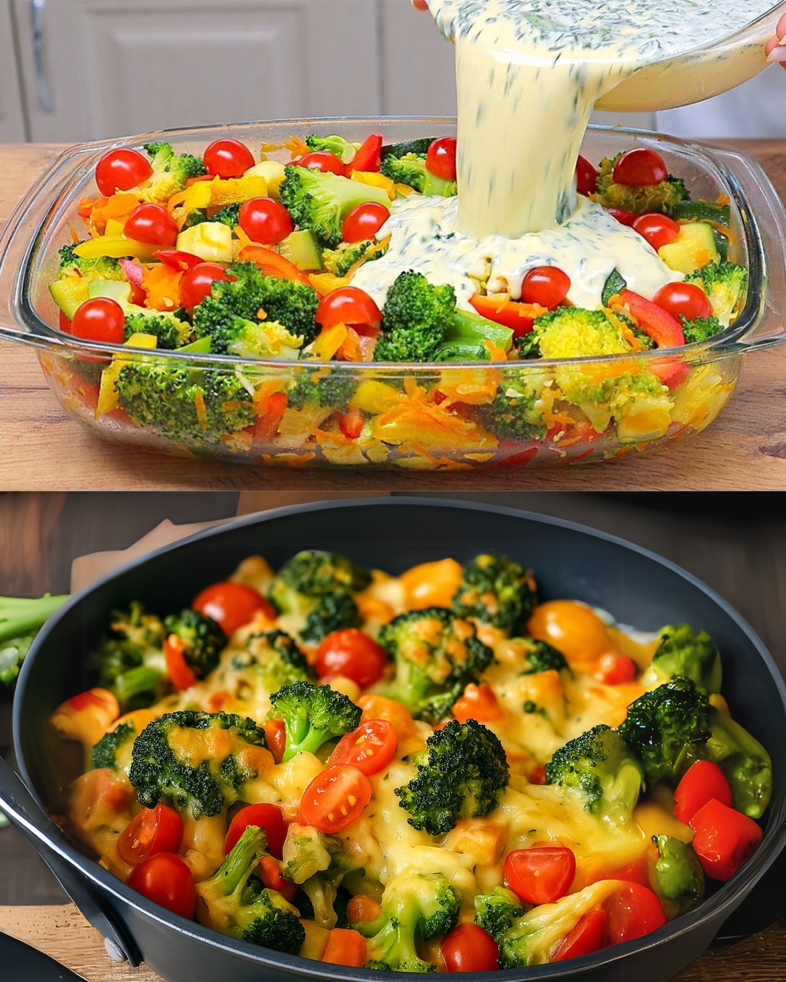 Prebacite smesu u lagano nauljenu posudu za pečenje i ravnomerno je rasporedite. Pospite rendanu mocarelu preko povrća.