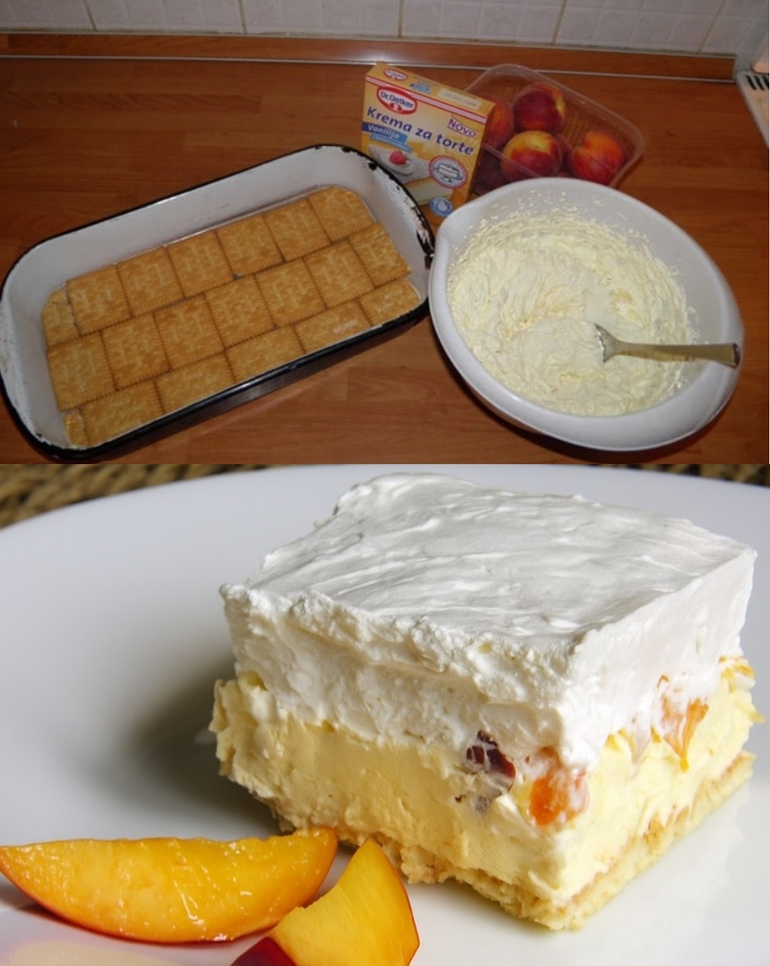 Breskve sitno narežite i pripremite ekstra slatko vrhnje. Ravnomjerno rasporedite kremu po keksima, na vrh rasporedite breskve, a zatim preko breskvi rasporedite šlag prije nego što temeljito ohladite cijeli sklop.