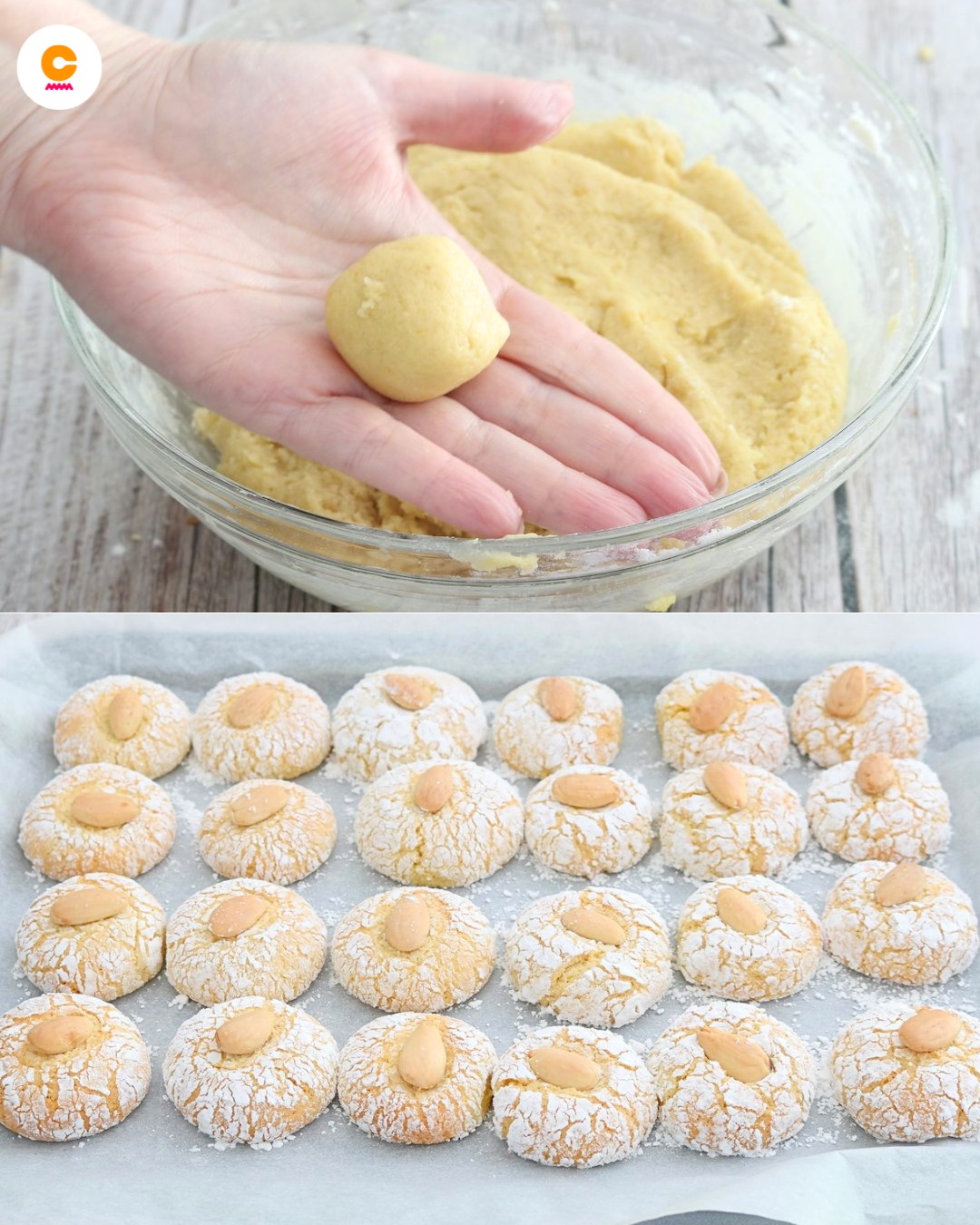 Za pripremu je dovoljno da sve sastojke sjedinite dok ne dobijete glatko i vlažno tijesto, oblikujete kuglice veličine oraha, uvaljate ih u obilje šećera u prahu, lagano spljoštite, ukrasite cijelim bademom i ispečete do zlatne boje.
