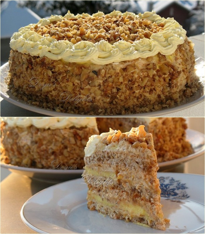 Ova torta je pravi klasik među svečanim desertima – lagane kore od bjelanaca, dvije vrste krema i bogat sloj karameliziranih oraha daju joj luksuzan izgled i savršen balans okusa. Savršena je za praznike, rođendane ili posebne prilike.