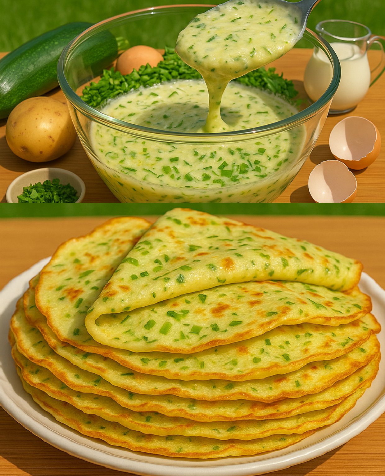 Određeni recepti proizlaze iz želje za praktičnošću i na kraju se pretvaraju u osnovna jela. Upravo je to slučaj s receptom za palačinke od tikvica i krumpira. Jednog sam ga jutra pripremila od ostataka povrća uz osnovne sastojke za smočnicu: jaja, mlijeko i brašno. Rezultat je bilo jelo koje je bilo izrazito pahuljasto, hrskavo i ukusno, što me natjeralo da ga podijelim. Ove slane palačinke od povrća ne samo da su jednostavne za pripremu, već su i zasitne i iznimno svestrane.