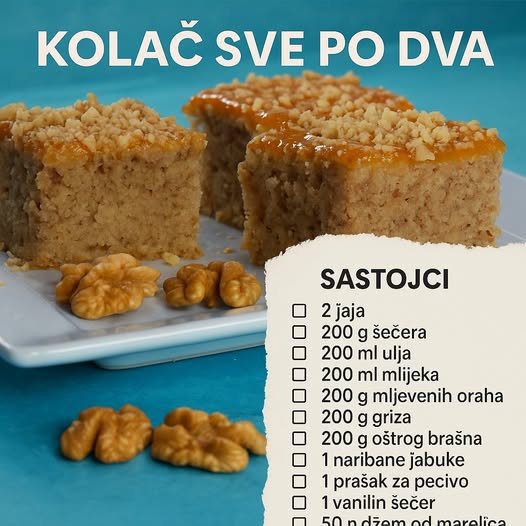 4️: Pečeni kolač premazati džemom od marelica i posuti nasjeckanim orasima.