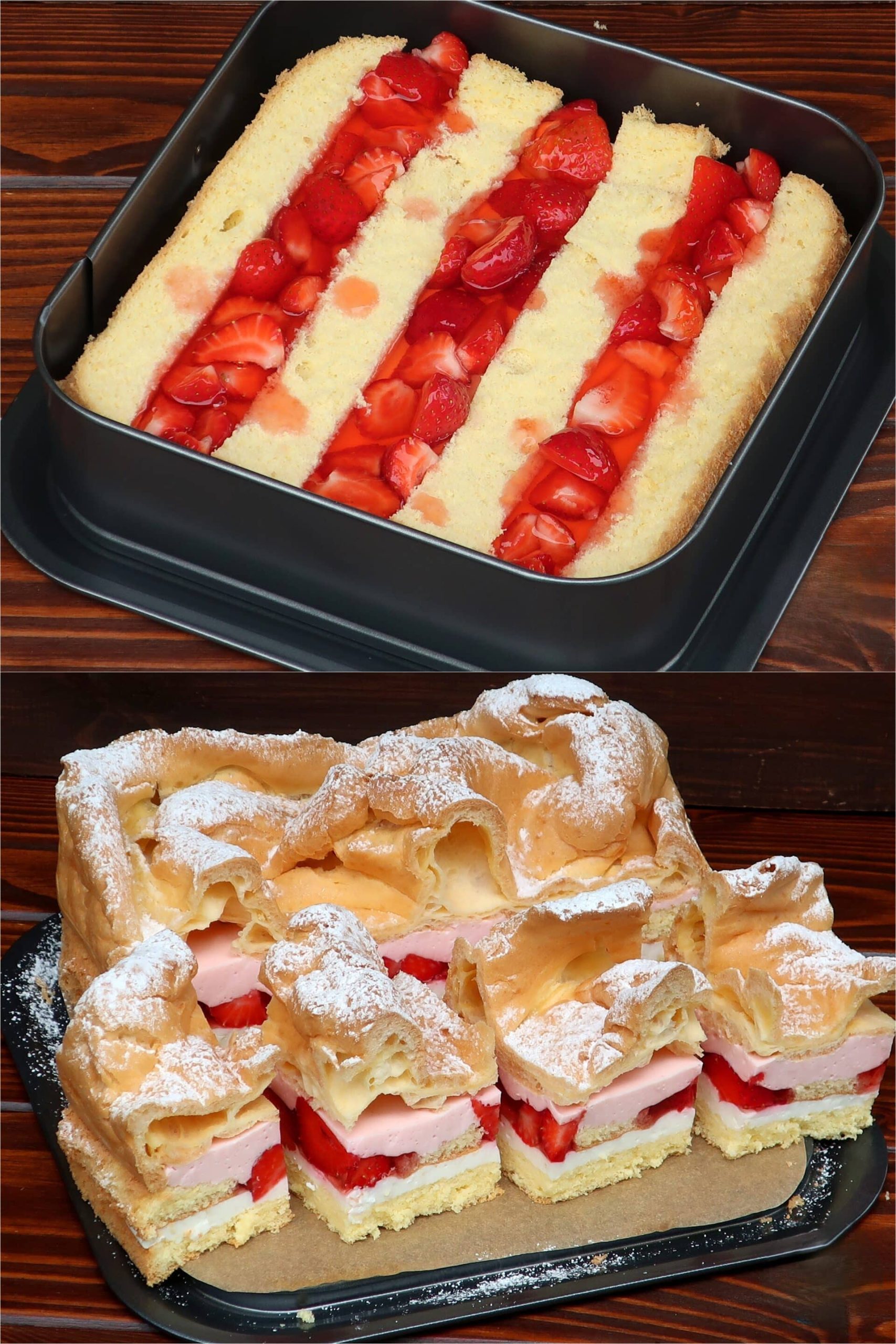 – Na to složiti biskvitne trake, a između njih rasporediti narezane jagode.