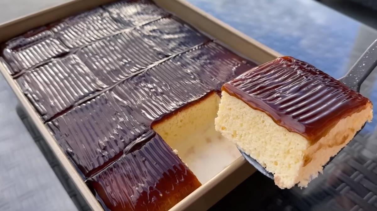 Kada se testo ispeče, ostavite da “odmori” pet minuta i izboskajte ga čačkalicom. Zatim ga prelijte i preko toga premažite karamelom.