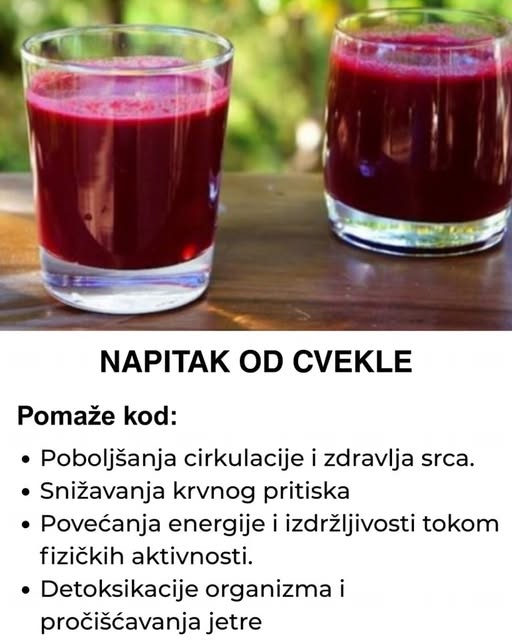 Napitak od cvekle je pravo prirodno čudo za vaše zdravlje. Pomaže u poboljšanju cirkulacije, snižavanju krvnog pritiska, povećanju energije i izdržljivosti, te detoksikaciji organizma. Takođe, čini se korisnim za zdravlje kože i mentalno zdravlje.