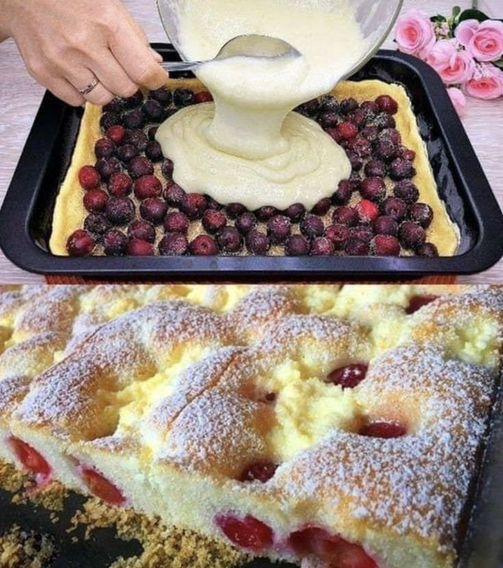2. Zatim staviti tijesto na pleh obložen papirom za pečenje i rasporediti oprane, odstranjene koštice trešnje po njemu.