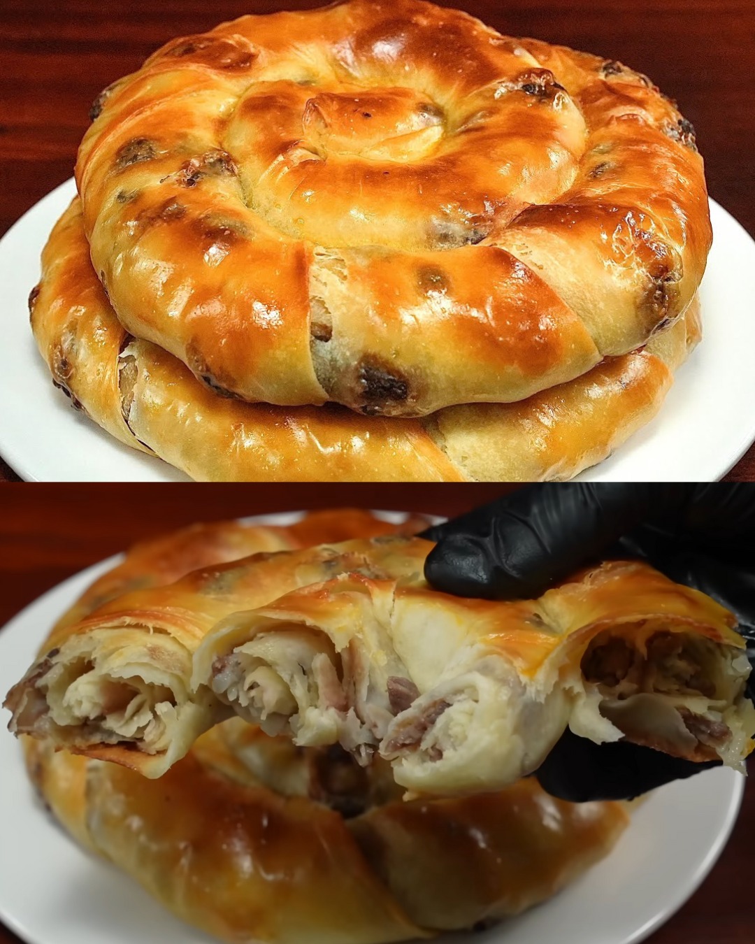 Ohlađenu juneću smjesu ravnomjerno rasporediti, pa zarolati čvrsto kao švicarsku roladu. Oblikujte ga u spiralu i stavite na pleh obložen papirom za pečenje. Pokrijte kiflice i ostavite da se dižu 30 minuta. Pečenje (35-40 minuta): Zagrijte pećnicu na 185°C (365°F). Zapršku za jaja pripremite tako što ćete izmiješati žumanjke, mlijeko i sol. Nanesite obilno premaz od jaja na rolice.