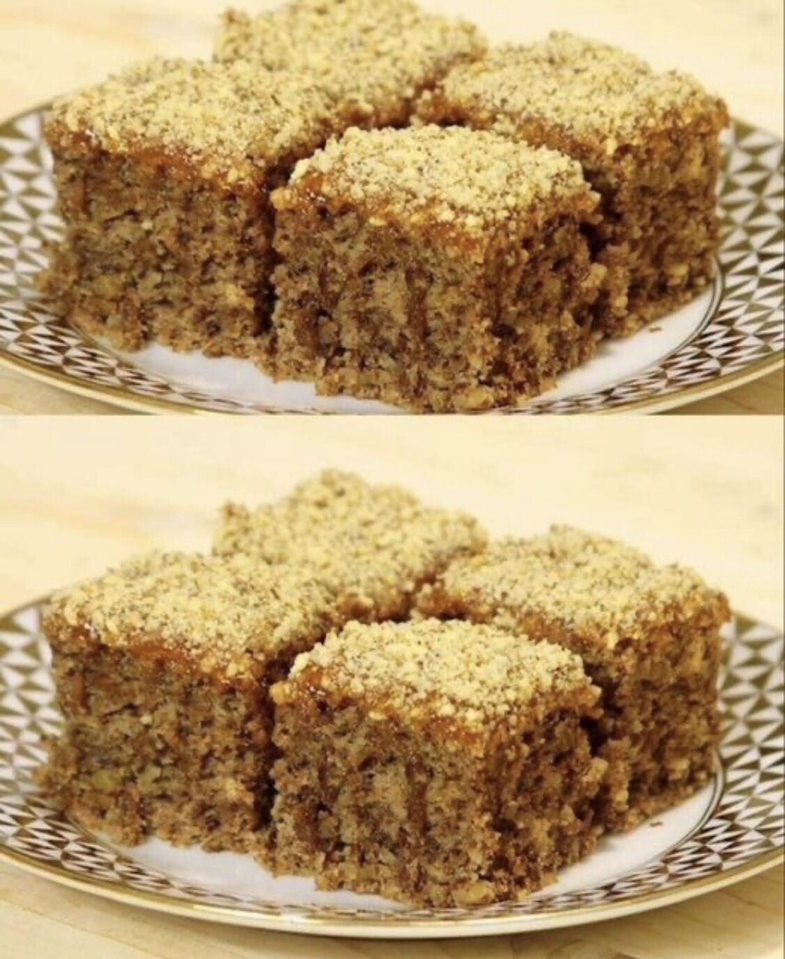 5. Vruć kolač premažite s preostalim džemom (4 kašike) i pospite s preostalim mljevenim orasima (4 kašike). Ostavite da se ohladi, a zatim isjecite na kocke.