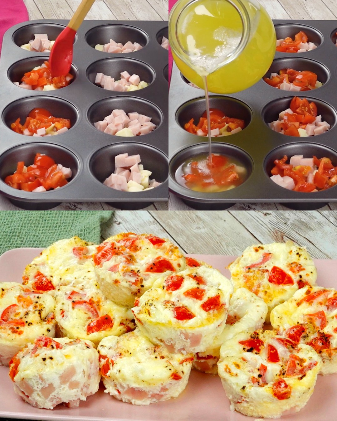 – Ravnomjerno rasporedi bjelanca u kalupe, preko sira i šunke – ne puniti do vrha jer će se malo podići tokom pečenja.