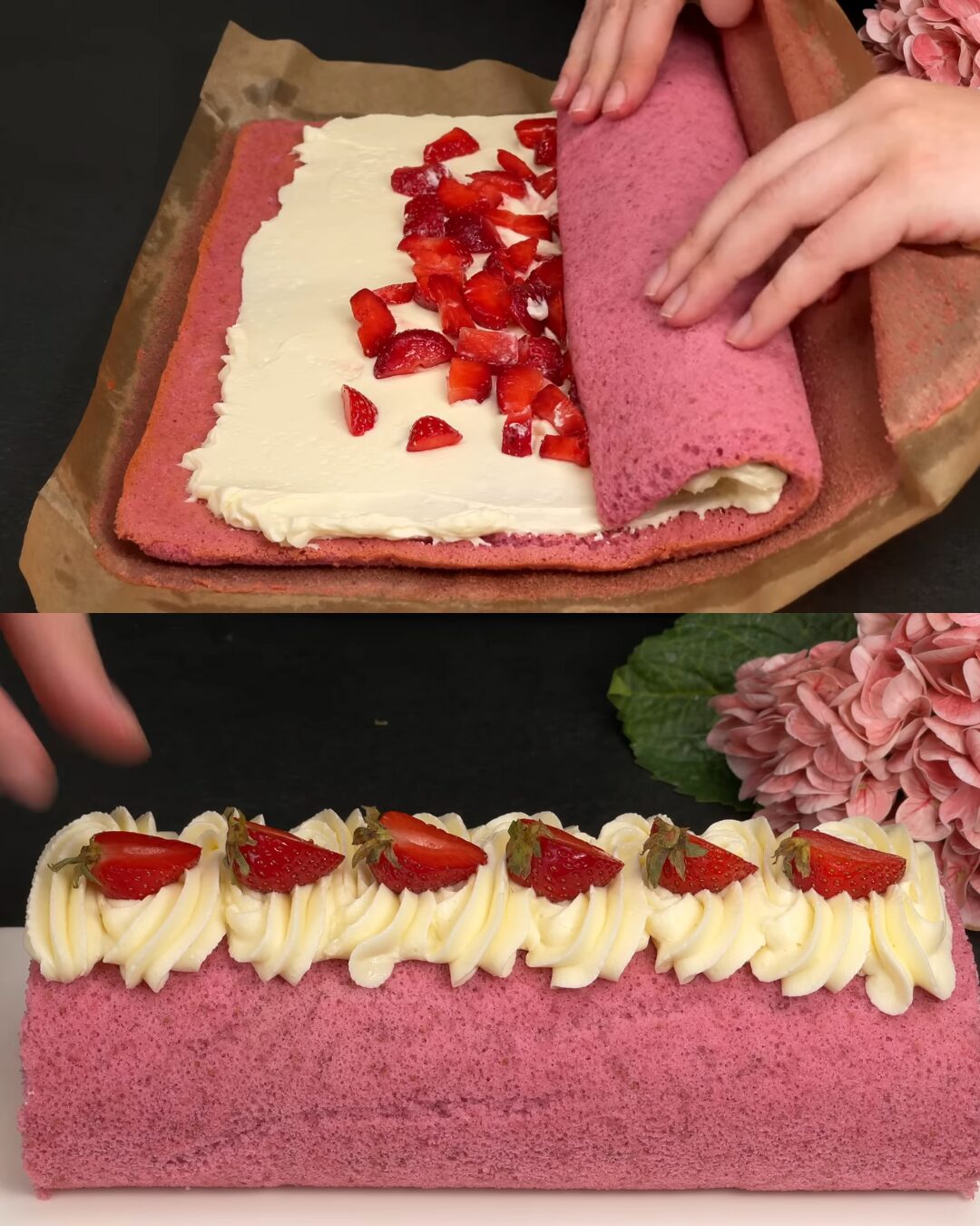 Zamisli da režeš kroz mekani, ružičasti biskvitni rolat ispunjen kremastim filom od sira i sočnim jagodama — upravo to nudi ovaj rolat! Elegantna, šarmantna i ukusna poslastica savršena za posebne prilike ili svakodnevno uživanje.