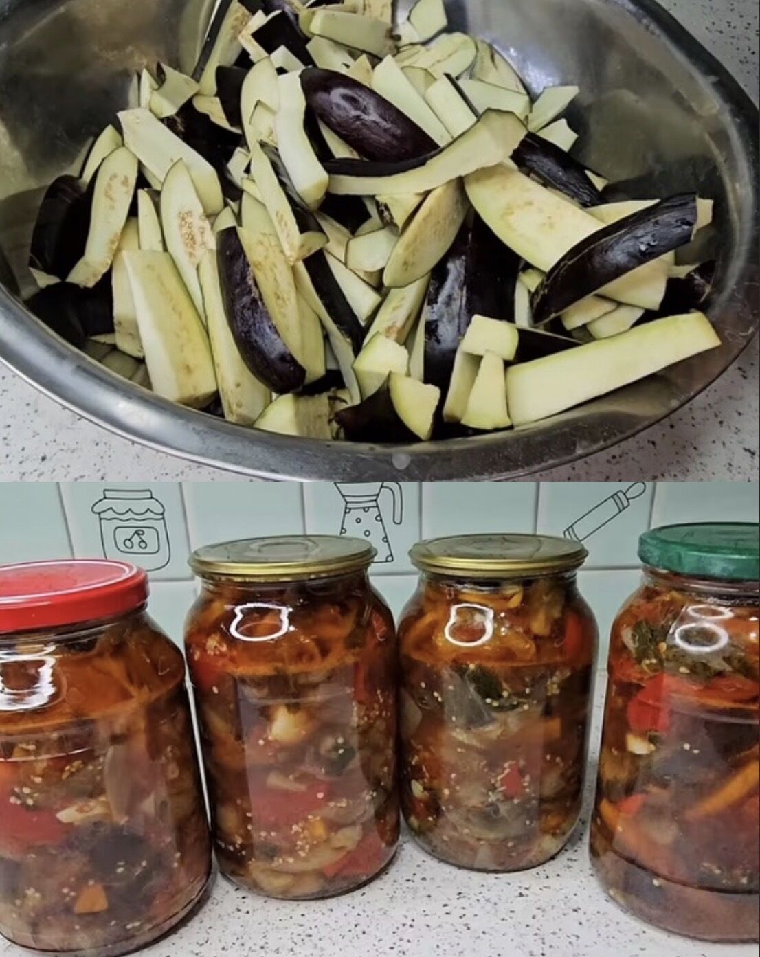 Pripremite sterilne tegle i poklopce. Vrelu salatu sipajte u tegle, do vrha, i zatvorite poklopcima.