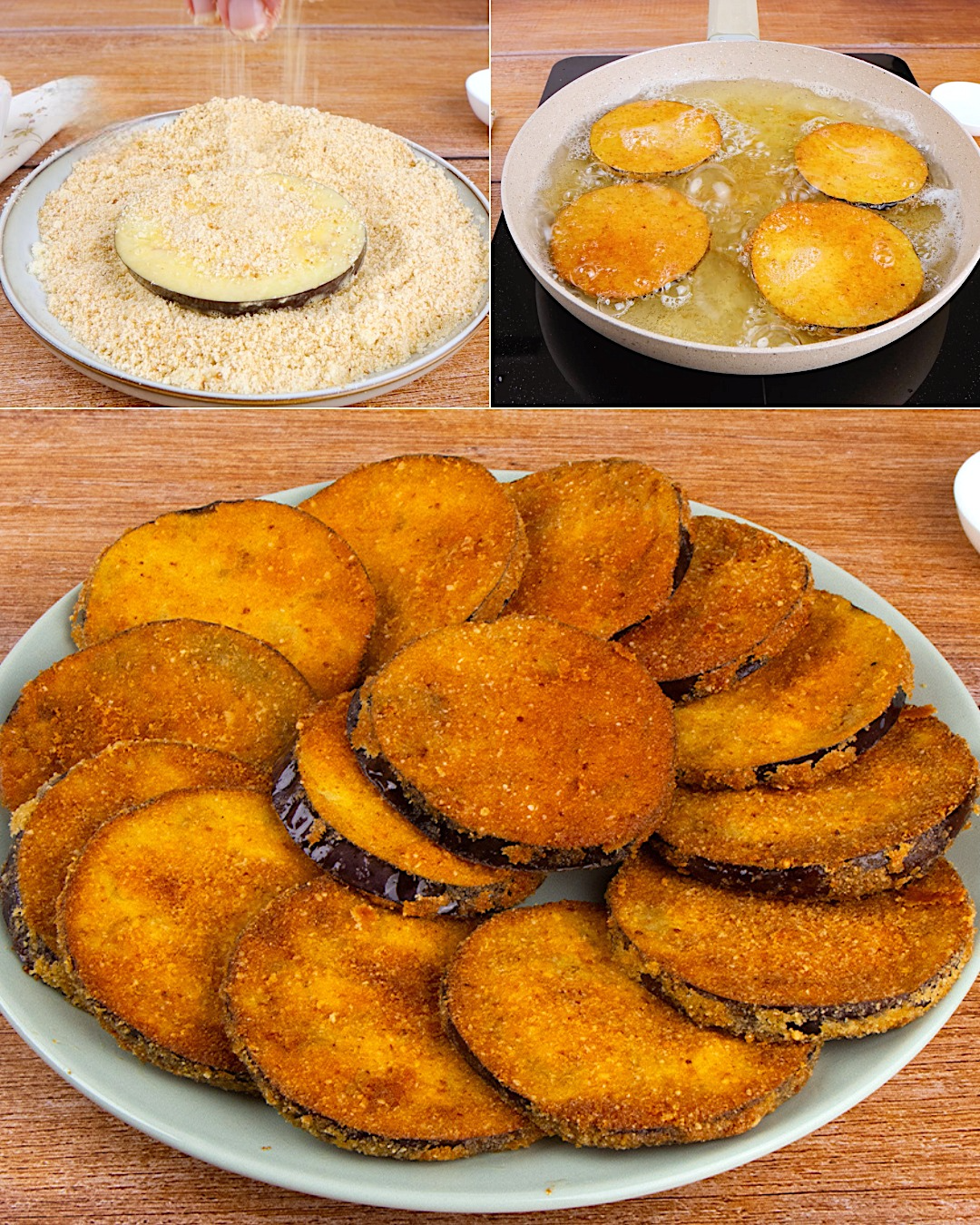 * Svaku krišku patlidžana uvaljaj prvo u brašno, zatim u jaje, pa u smjesu prezli i parmezana.