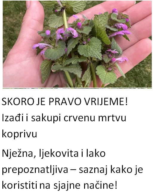 Crvena mrtva kopriva (Lamium purpureum) pripada porodici usnatica (kao i nana), i raste nisko pri zemlji. Često se meša sa biljkom koja se zove „henbit“, ali nema razloga za brigu – i henbit je jestiva biljka. Obe vrste rastu u sličnim uslovima i često se mogu naći jedna pored druge u rano proleće.