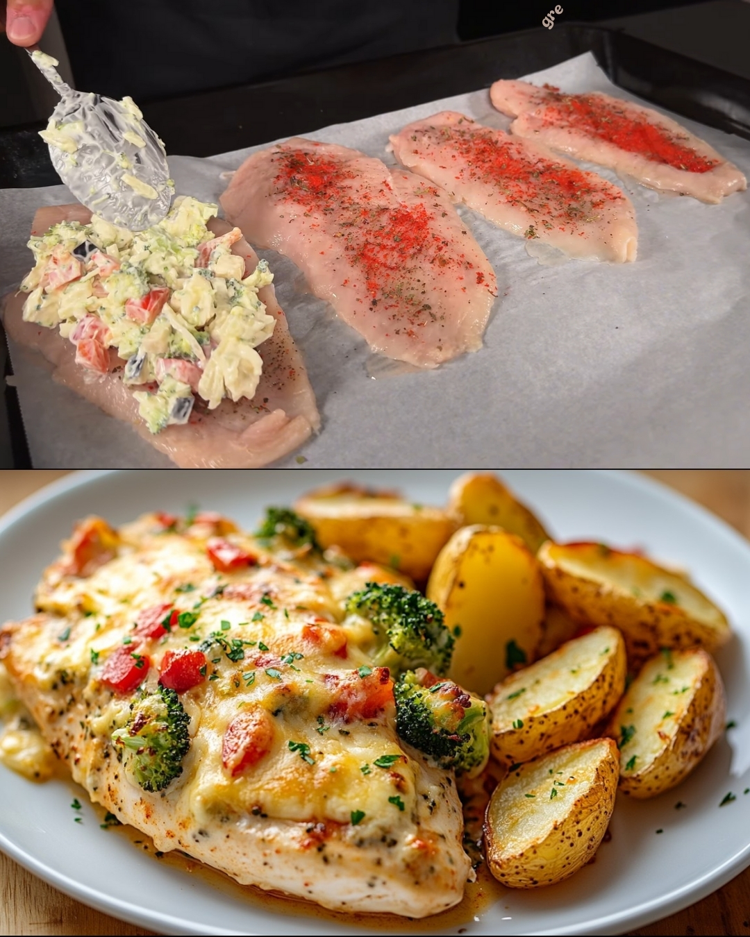 Ukusna i kremasta zapečena piletina sa šarenim povrćem i rastopljenim sirom, poslužena uz hrskave bijele krompire sa belim lukom i svježim začinskim biljem. Idealno jelo za porodični ručak ili večeru punu ukusa.