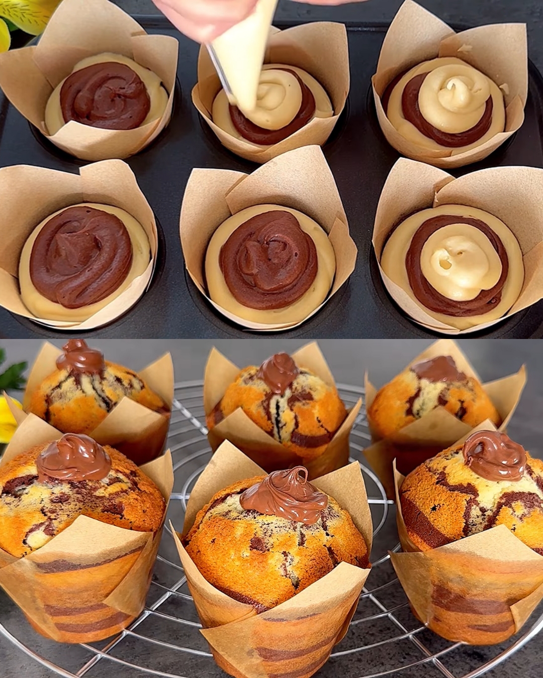 U pripremljeni kalup sipajte naizmjenično kašike bijele i tamne smjese. Nožem ili štapićem lagano povucite kroz tijesto u obliku broja 8 da dobijete mramorni uzorak, pazeći da ne promiješate previše.