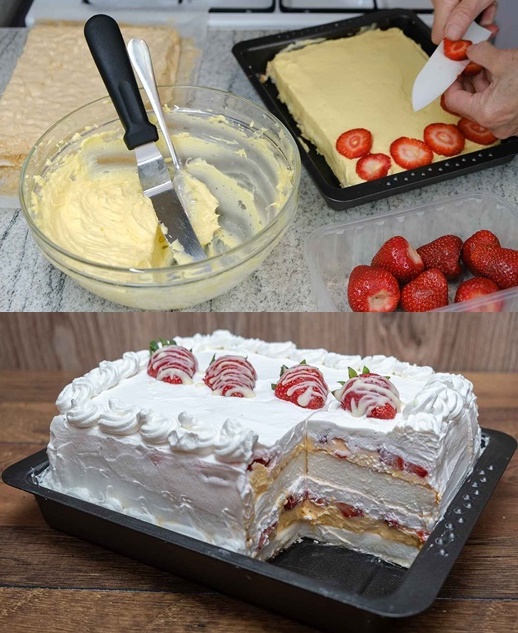 Pokrijte drugom korom. Prekriti preostalim filom. Isecite jagode i stavite na fil. Prekrijte tortu preostalim šlagom. Po želji ukrasite svježim jagodama.