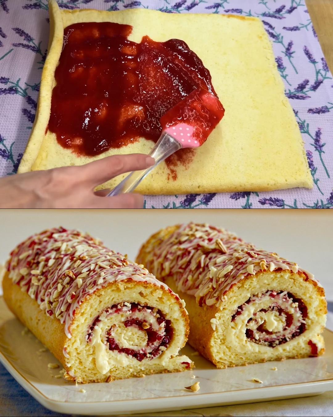 Pažljivo odmotaj ohlađeni biskvit. Premaži mlijekom da malo omekša. Ravnomjerno rasporedi ohlađeni džem, ostavljajući 1 cm margine sa strane. Ponovo urolaj bez ubrusa u čvrstu spiralu.