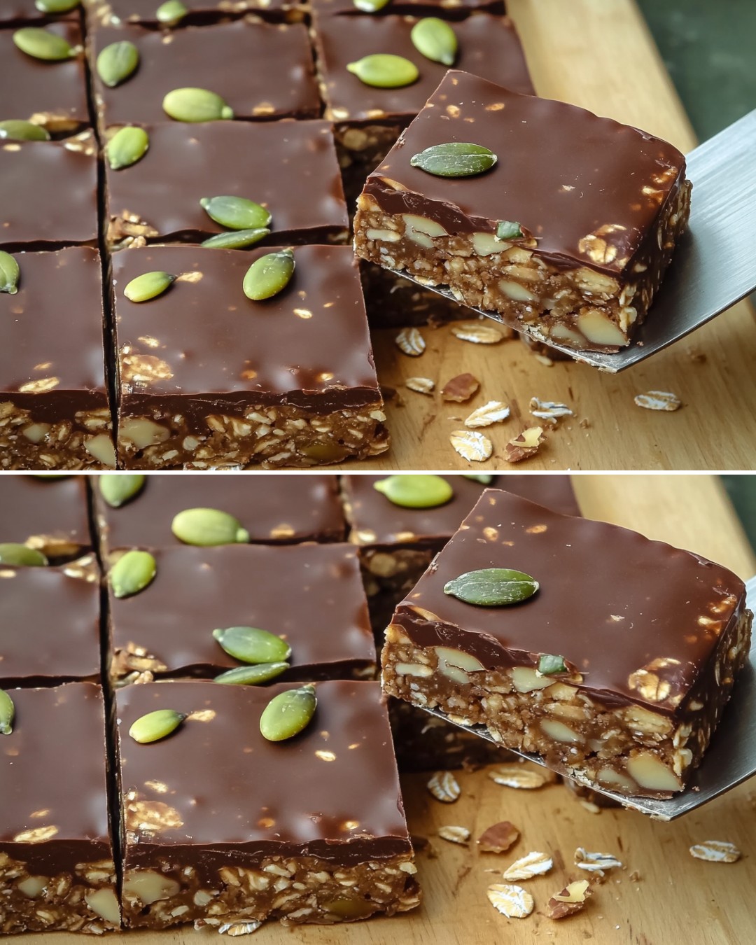 Prelijte otopljenu čokoladu preko ohlađene baze i rasporedite špatulom da prekrije cijelu površinu. Dok je čokolada još vlažna, pospite sjemenkama bundeve.