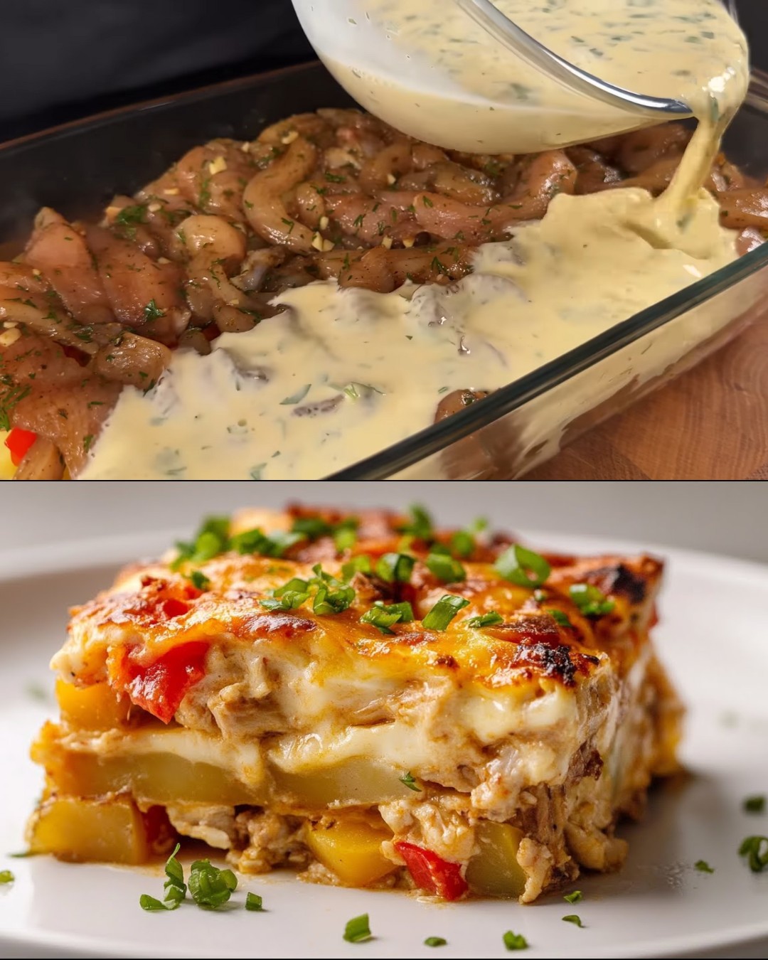 7. **Pečenje:** Peći 40–50 minuta, dok krompir ne omekša, piletina se ispeče, a sir ne dobije zlatnu boju.